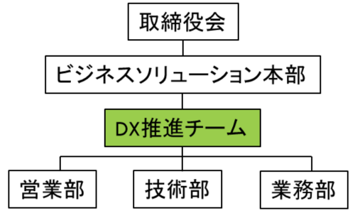 2023年10月より、ビジネスソリューション事業部より、事業本部直轄の組織として「DX推進チーム」を発足させました。経営陣・社内各部門との連携を図りながらDX推進を加速させてまいります。
